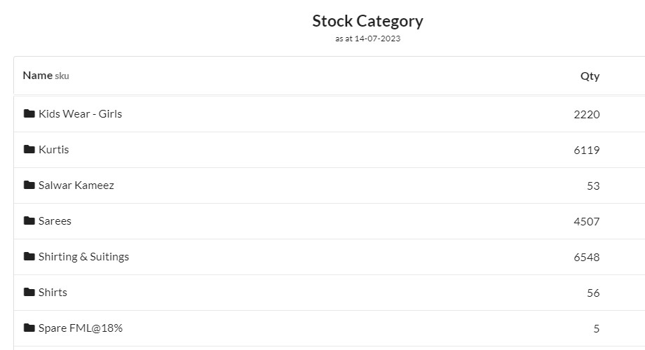 Output books has Stock Category report. There easily you will get stock quantity and stock value category wise. Here Filter option is available to search your category easily. You will get data month wise, Last month, Last Quarter, Fiscal year, Last Fiscal year etc.